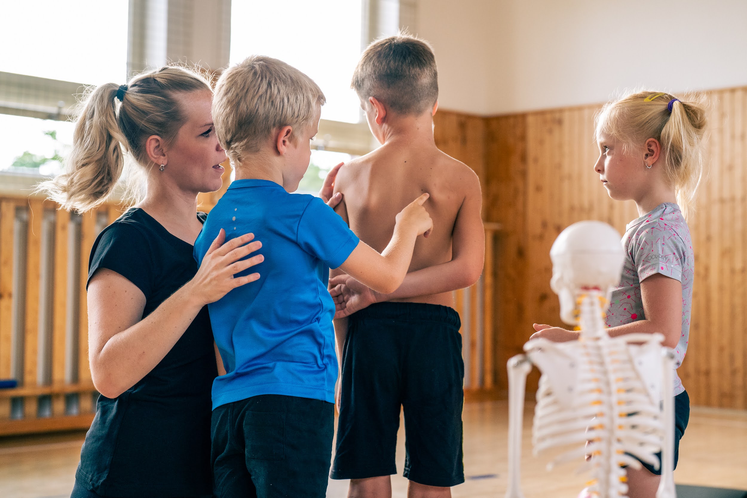 When a child needs to work with a certain part of the body, they first have to become aware of it — to realize that it’s even there. With children, we look for the specific body part on a skeleton model or on their own body, we touch it, and we observe it using mirrors or photos. It may seem unnecessary, but children (and of course adults as well) often don’t have a well-developed sense of their own body. Yet this awareness is essential for coordination, balance, and confidence in movement.